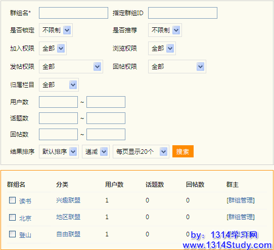 2、上图中的群组列表区域,会员在前台创建的所有群组或是对群组搜索的结果都可以展示在这部分区域。管理员可以对群组进行批量的删除、锁定/取消锁定、推荐/取消推荐 、转移到新分类、合并群组操作。点击上图中的“群组管理”,即可进入具体群组的设置页面进行管理。