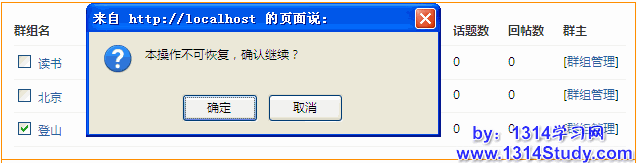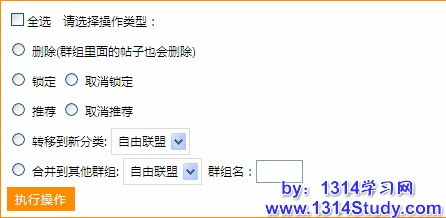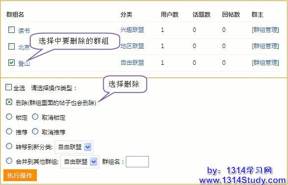 选择上图中列表栏中的需要删除的群组名,然后再选择操作栏中一个删除按钮,最后点击“执行操作”按钮即可进行批量删除。如下图所示: