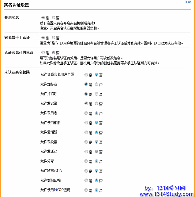 UCenter Home 2.0 后台 => 基本设置 => 站点设置 => 实名认证设置: