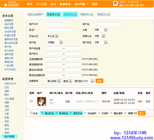 管理员进行实名认证的位置是:UCenter Home 2.0 后台 => 批量管理 => 用户管理 => 实名未认证/实名已认证
