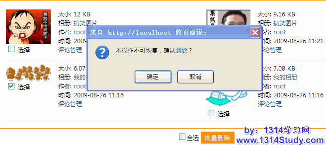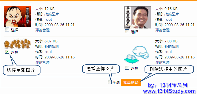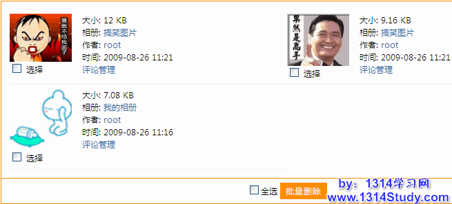用 UCenter Home 2.0 的管理员帐号登录后台,批量管理 => 图片,即可看到下图所示: