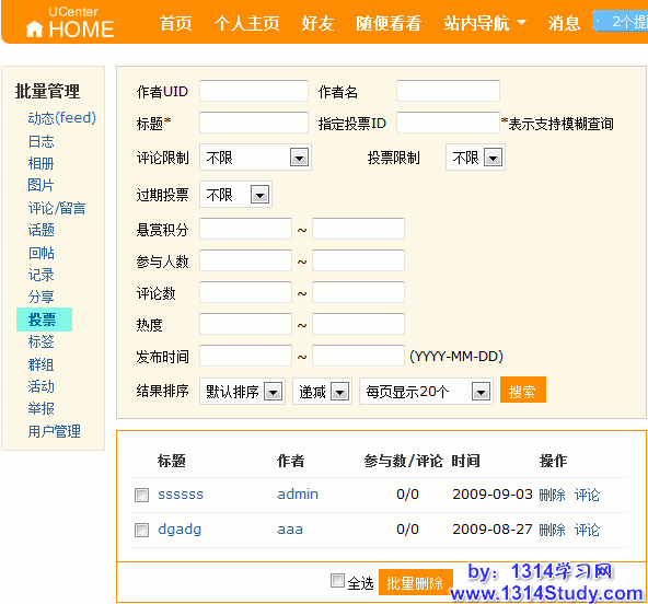 UCenter Home 2.0 新增投票功能,用户可以发起投票,站长可以在后台针对所有投票进行管理,包括搜索、批量删除及管理其评论信息。