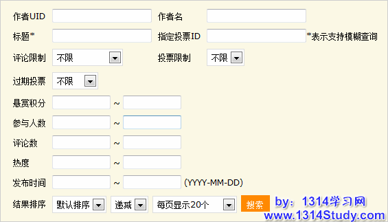 已有的搜索条件有:作者 UID 、作者名、标题、指定投票ID、评论限制、投票限制、过期投票、悬赏积分、参与人数、评论数、热度、发布时间进行搜索,搜索的结果可以设置显示的排序,例如按照发帖时间、递增、递减、每页显示数进行查看。