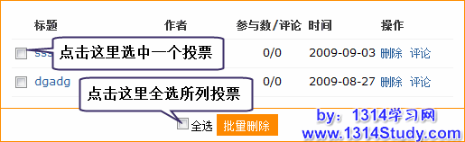 删除:选择一条或者多条投票,点击前面的多选框,点击底部的批量删除即可进行删除。