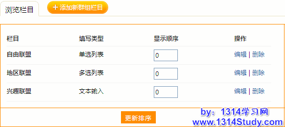在“浏览”选项卡下,可以看到已存在群组栏目。可以编辑和删除这些群组栏目。点击“编辑”进入群组栏目编辑页面: