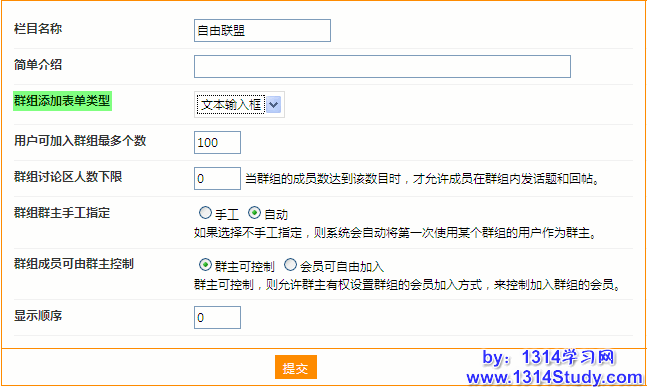 这里可以编辑该群组栏目的详细信息,重点介绍下“群组添加表单类型”,在它的下拉菜单中有三种类型可选:“文本输入框”、“单选列表框”、“多选列表框”,这里的设置会决定在该群组栏目下,用户是否可以创建新的自定义群组。