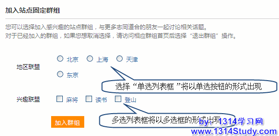 2、当该群组栏目选择“单选列表框”、“多选列表框”时,将分别以单选按钮与复选框的形式出现。例如地区联盟选择“单选列表框”,并且填入“北京”、“上海”、“天津”、“东京”四个选项。兴趣联盟选择“我选列表框”,并且填入“麻将”、“读书”、“登山”三个选项。