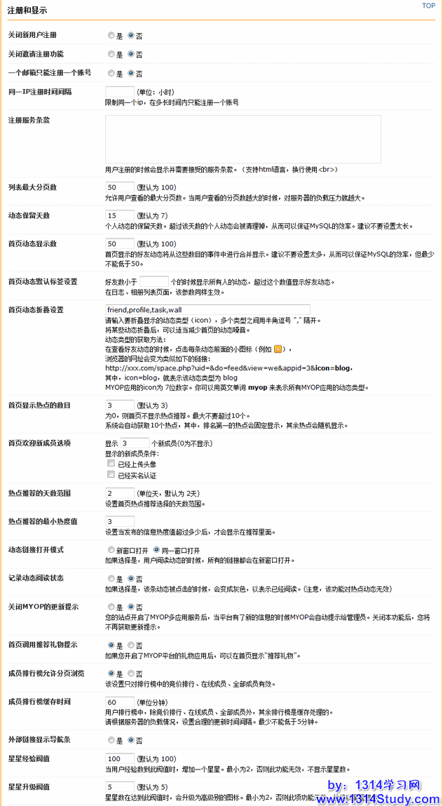 8、首页动态显示数:首页显示的好友动态将从这些数目的事件中进行合并显示。建议不要设置太多,从而可以保证 MySQL 的效率,但最少不能低于50。
