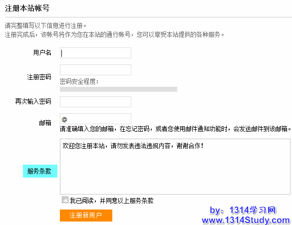 5、注册服务条款:用户注册的时候会显示并需要接受的服务条款。(支持html语言,换行使用