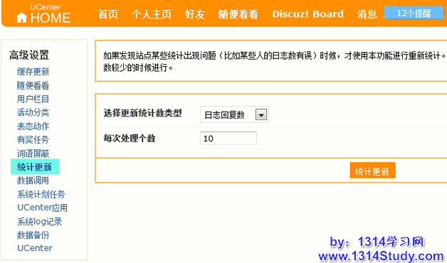 登录 UCenter Home 2.0 首页 => 设置 => 高级管理 => 高级应用 => 统计更新,如下图所示: