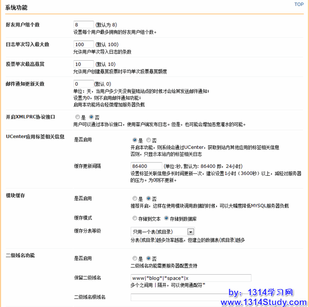 UCenter Home 2.0 后台 => 基本设置 => 站点设置 => 系统功能: