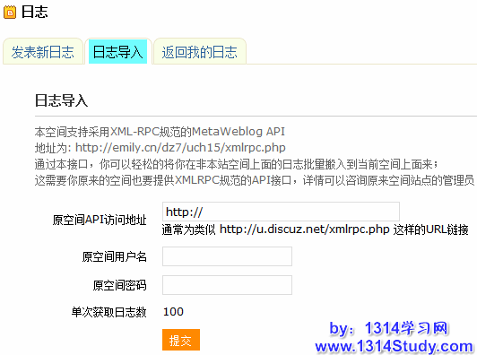 通过本接口,你可以轻松的将你在非本站空间上面的日志批量搬入到当前空间上面来。比如可以将 X-Space 空间日志导入 UCHome 空间日志中。