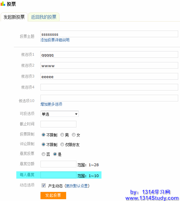 3、投票单次最高悬赏:允许用户创建悬赏投票时平均单次投票悬赏额度(默认 10)。
