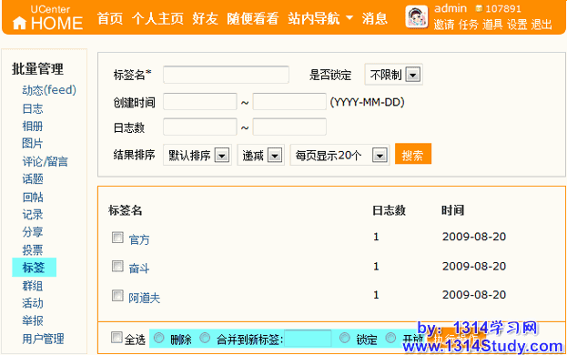 UCenter Home 中的标签是在发布日志时添加的,添加的标签可以在“UCenter Home 后台 => 批量管理 => 标签”中管理。