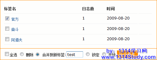 上部粉红色背景的区域是搜索标签的搜索条件设置区域,可以通过设置标签名、是否锁定、创建时间、关联的日志数、结果的排序规则来搜索出需要查看的标签,并对其进行管理。其中标签的创建时间的时间格式为“YYYY-MM-DD”,即“2009-01-19”这样的格式。