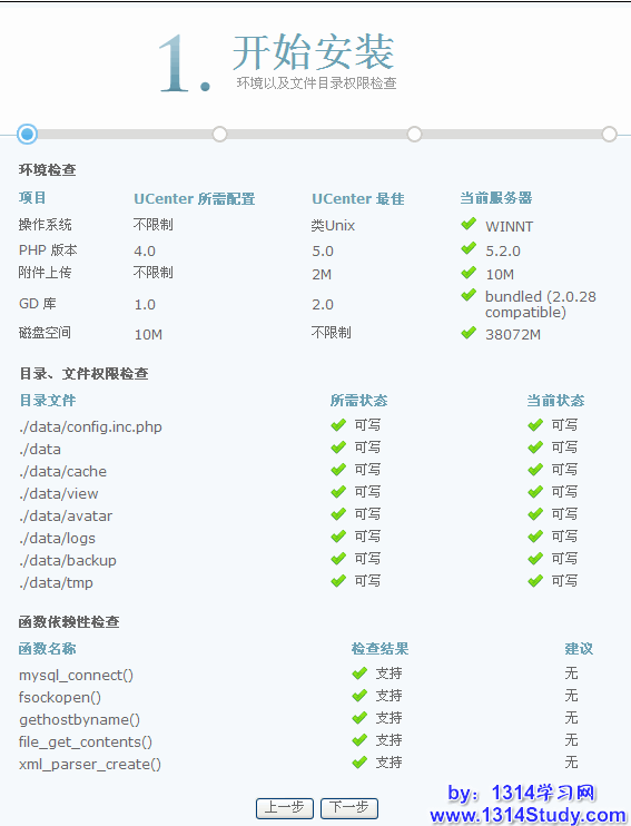 上图中阅读授权协议后点击“我同意”就进入到下面的环境检查和文件权限目录检查页面,如下图所示: