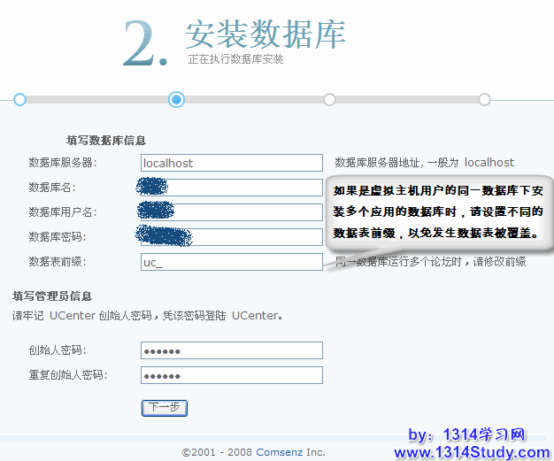 检查配置过关后点击“下一步”进入数据库信息配置页面,如下图所示: