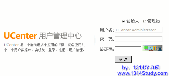 数据库安装完毕点击“安装用户中心成功,点击进入下一步”则自此 UCenter 安装完毕,进入 UCenter 后台登录界面,如下图所示: