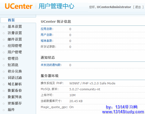 输入密码后点击“登录”进入到 UCenter 的后台,如下图所示: