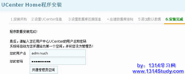 4、输入用户名和密码,系统将这个用户名设为 UCenter Home 管理员,并开通管理员空间。