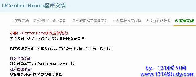 3、一切运行正常,删除 UCenter Home 目录下的 install 文件夹。