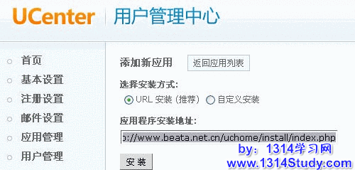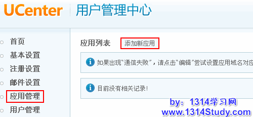 1、进入 UCenter 后台 => 应用管理 => 添加新应用,如下图所示: