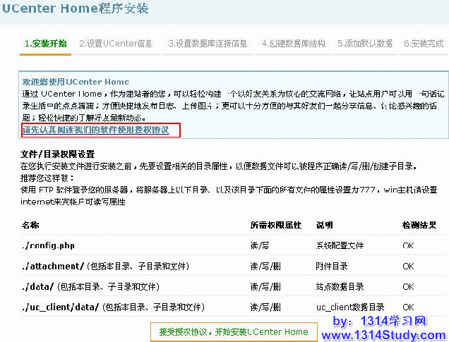 接受授权协议,开始安装 UCenter Home。