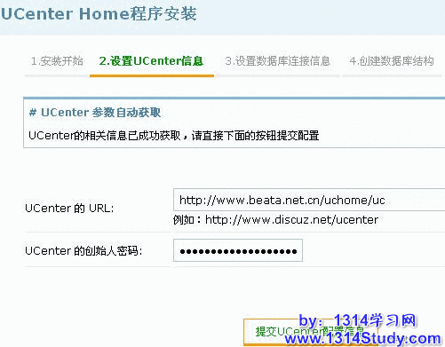 UCenter 的参数信息时自动获取的,其中UCenter 的 URL 就是您的 UCenter 访问地址,UCenter 的创始人密码即您安装 UCenter 时设置的登录密码。如果获取成功,您无需填写,直接点击下面的“提交 UCenter 配置信息”即可。