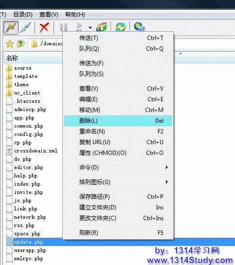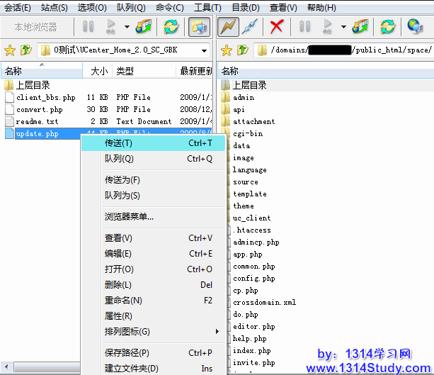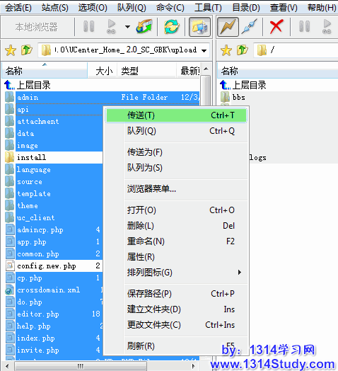 通过 FTP 软件上传新的 UCenter Home 程序,将 upload 文件夹下除 config.new.php、 install 目录外,其他程序全部上传并覆盖原有文件。
