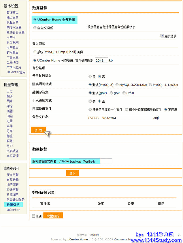 备份 UCenter Home 数据库数据,请到 UCenter Home 的管理中心,点击“高级应用”里的“数据备份”,在此备份 UCenter Home 数据。如下图所示: