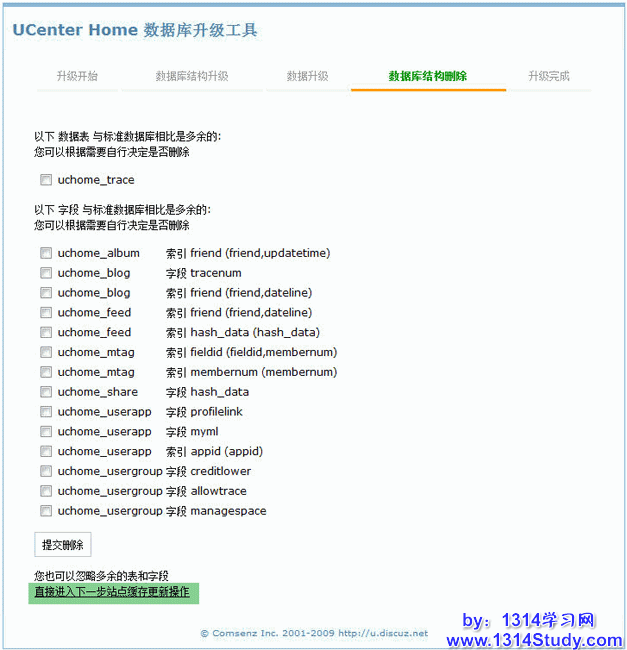 数据库结构删除,版本更新后多余的数据表和字段,在这里可以选择是否删除,如果这些新增的表或者字段不是你之前安装的插件的表和字段的话,建议选择删除。不删除可以忽略掉直接点击最下方的“直接进入下一步缓存更新操作”。