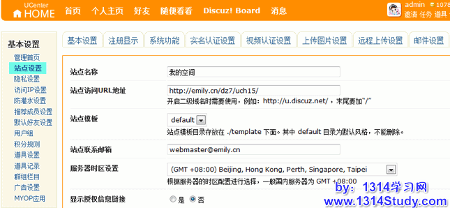 站点设置是对站点的一些全局设置,包括基本设置、注册显示、系统功能、实名认证设置、视频认证设置、上传图片设置、远程上传设置和邮件设置。