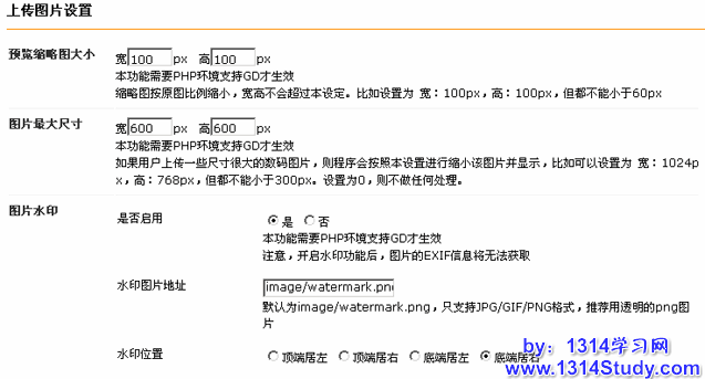 3、图片水印:选择“是”开启图片水印功能,这里也需要 PHP 环境支持 GD 才生效。