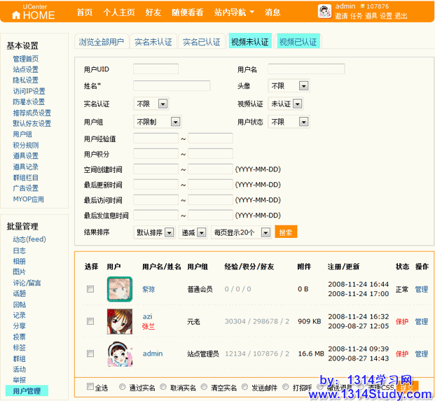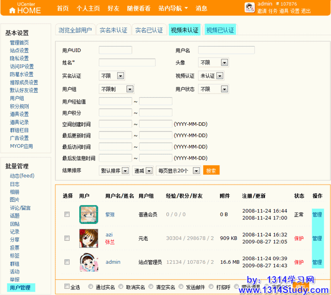 管理员进行视频认证的位置是:UCenter Home 2.0 后台 => 批量管理 => 用户管理 => 视频未认证/视频已认证