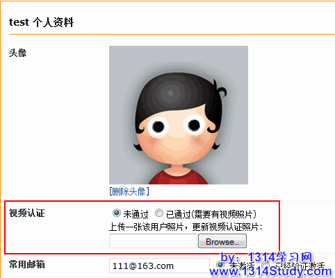 点击某个用户的“管理”,在“个人资料”一栏可以看到视频认证通过设置: