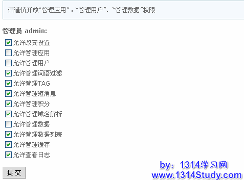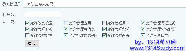 UCenter 后台管理员选项可以添加、删除管理员,修改管理员权限以及修改 UCenter 创始人的密码。