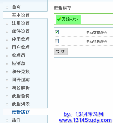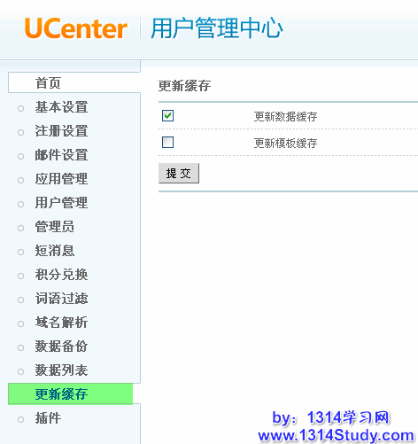 登陆 UCenter,点击左边菜单的“更新缓存”链接,即出现更新缓存的界面,如下图: