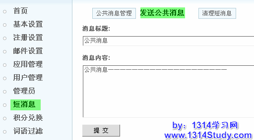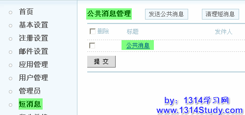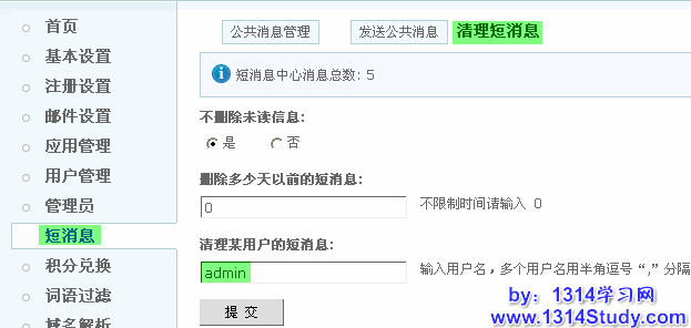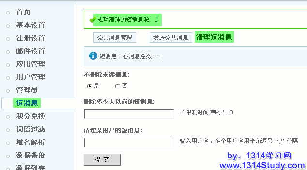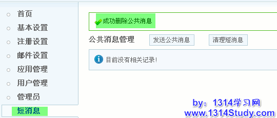 UCenter 短消息包含了 UCenter 所有应用的消息,可以管理公共消息和清理指定短信息。