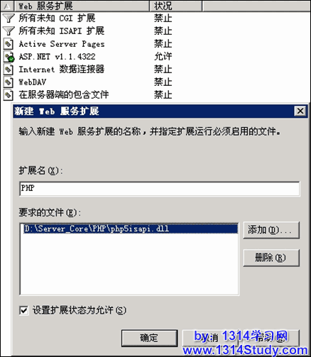 (5) 在如下图所示的"新建WEB服务扩展"对话框中,"扩展名"填写PHP,"文件"选择 X:\Server_Core\PHP\php5isapi.dll ,并设置该PHP扩展默认为允许。如下图所示: