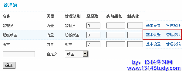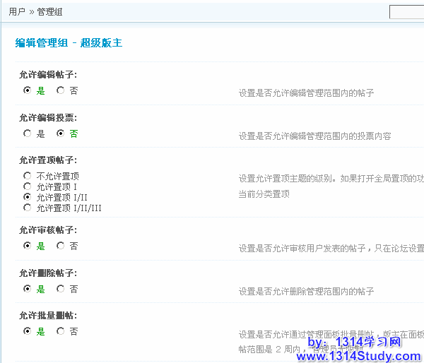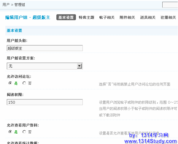 下面以超级版主为例,讲解一下管理组的各项设置。