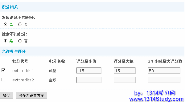 3)允许参与评分:允许该用户组用户在给其他用户评分的时候可以评哪种积分,以及可以评分的最大值与最小值,和24小时评分总量。