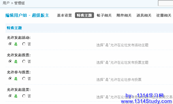 1)允许发起活动:选择“是”允许在论坛发布活动主题。
