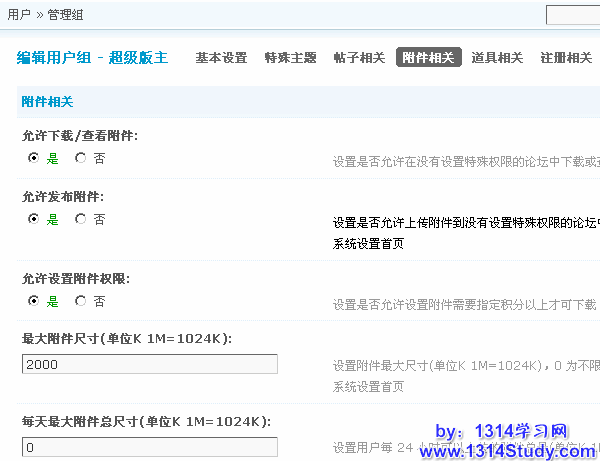 5)每天最大附件总尺寸(单位K 1M=1024K):设置用户每 24 小时可以上传的附件总字节数,0 为不限制。注意: 本功能会加重服务器负担,建议仅在必要时使用。
