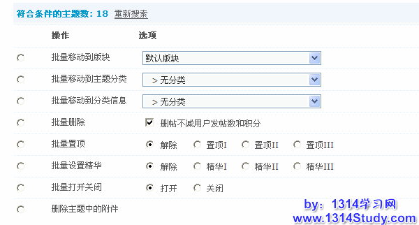 4、批量删除:是指把帖子批量删除掉,可以选择删贴不减会员的发贴数和积分。即把会员的帖子删除了,但是会员的发贴数和积分并没有减少。