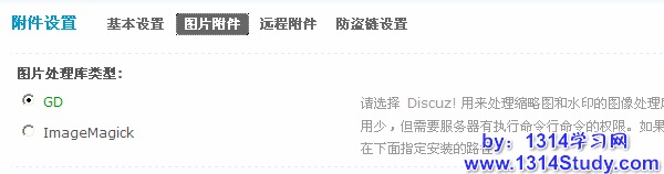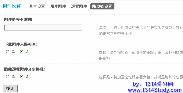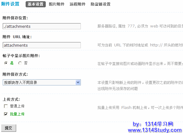 附件设置主要包括:基本设置、图片附件、远程附件和防盗链设置。