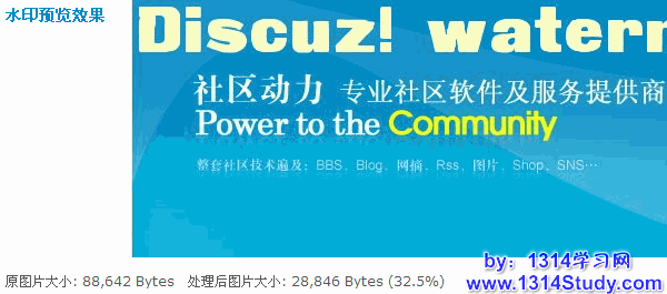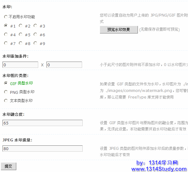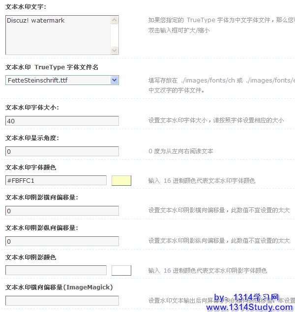 说明:如果选择中文为文字水印,需要在 C:\WINDOWS\Fonts\ 复制中文字字体,如:宋体,或者自己在网上下载喜欢的字体,存放在论坛的 \images\fonts\ch\ 目录下,然后文本水印 TrueType 字体文件名这里选择正确的中文字体。