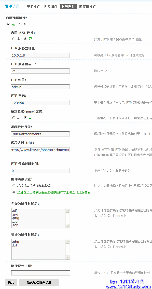 4)远程访问 URL:支持 HTTP 和 FTP 协议,结尾不要加斜杠“/”;如果使用 FTP 协议,FTP 服务器必需支持 PASV 模式,为了安全起见,URL浏览附件FTP连接的帐号不要设置可写权限和列表权限。