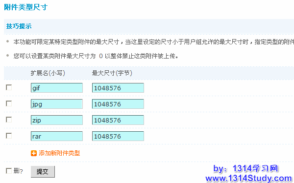 1)本功能可限定某特定类型附件的最大尺寸,当这里设定的尺寸小于用户组允许的最大尺寸时,指定类型的附件尺寸限制将按本设定为准。