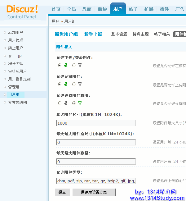 论坛管理后台 => 用户 => 用户组 => 附件相关: