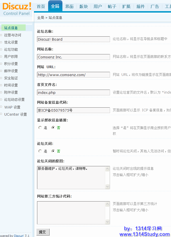 这个功能主要涉及到后台基本设置与论坛的前台显示效果有关的一系列设置。下面主要介绍一下这个功能的使用方法和注意事项。
